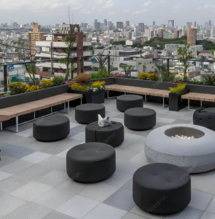 A cozy terrace café with a refreshing open-air setting. Perfect for relaxing, enjoying snacks, and spending quality time.