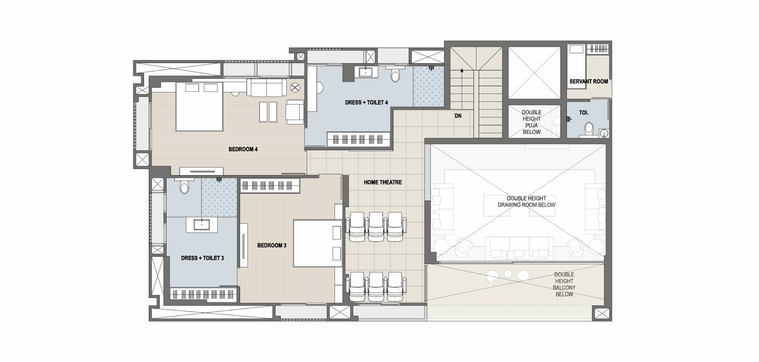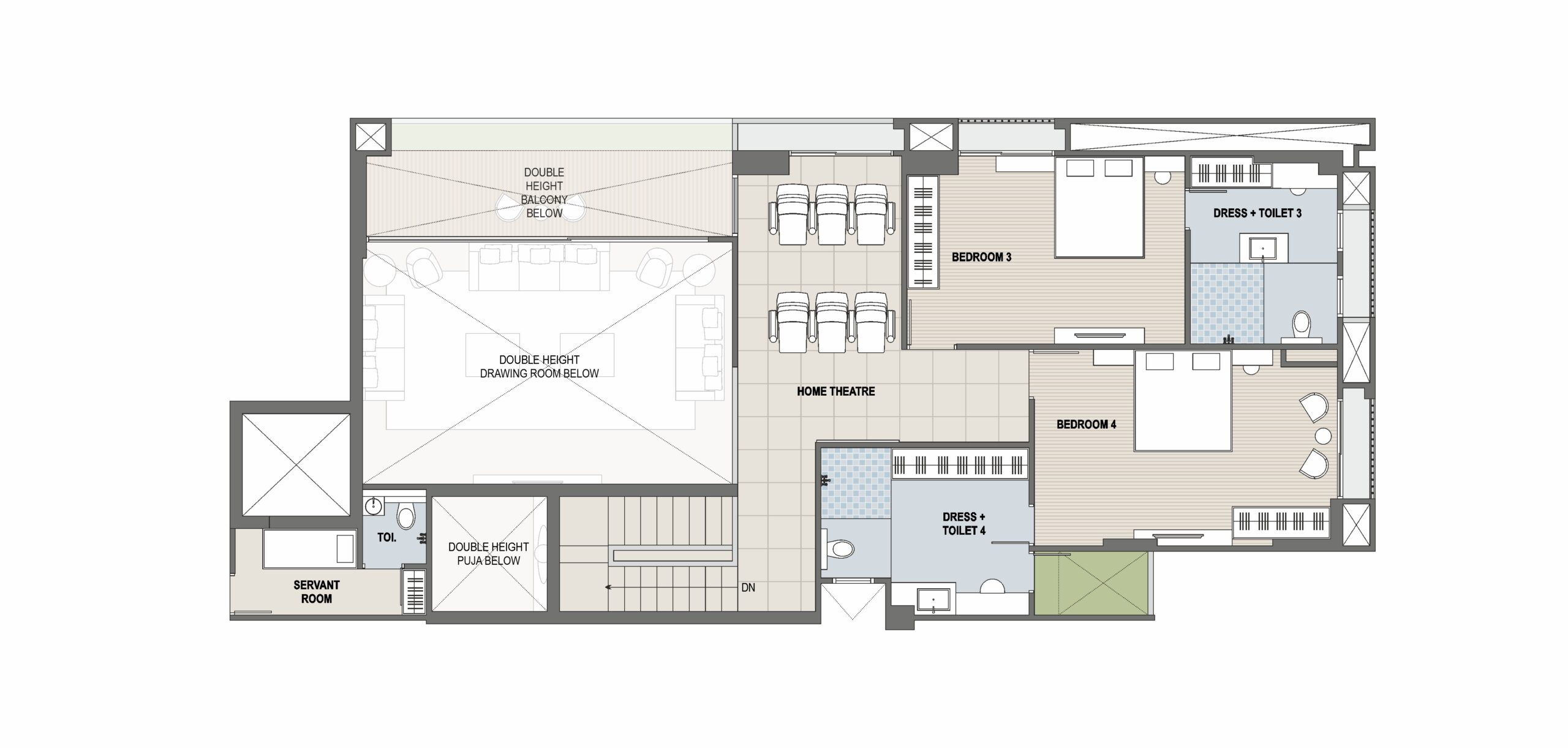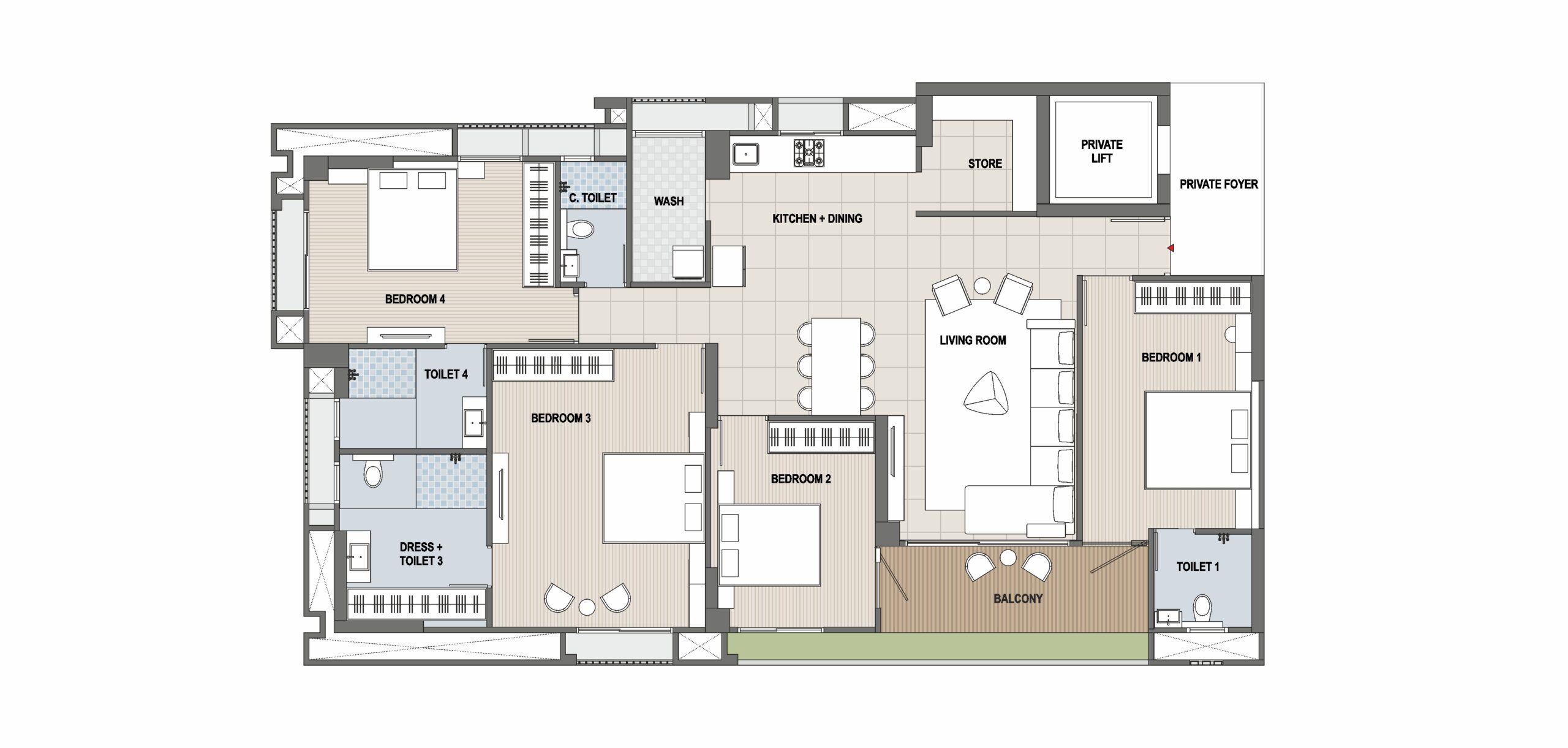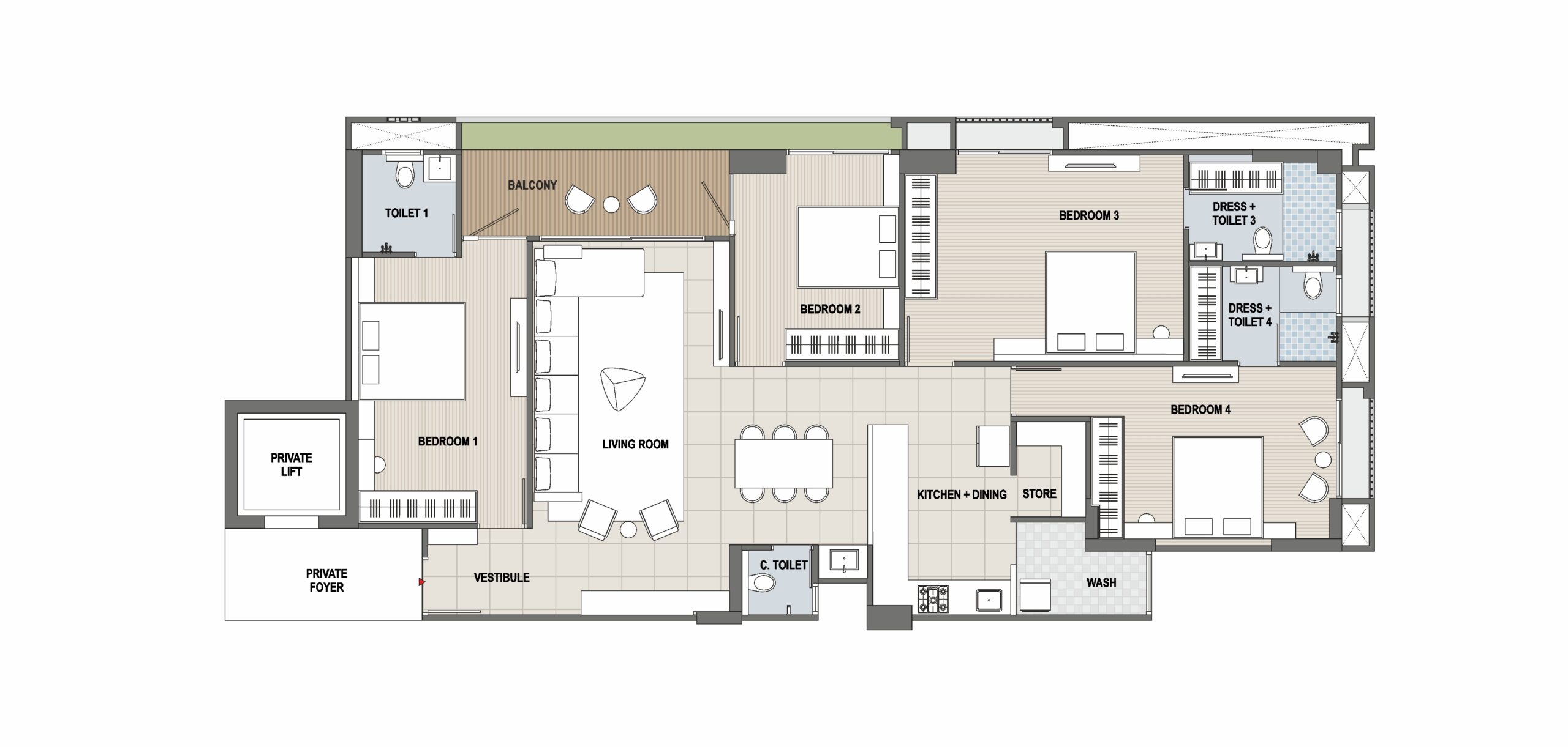 Toilets feature elegant designer tiles up to the lintel level for a modern look. Standard bath fittings and premium-quality sanitary ware ensure daily comfort. Concealed plumbing with proper ventilation and lighting provides a neat and functional finish.